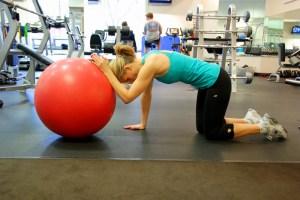 - The prep: Kneel in front of the stability ball with one arm on the ball and the other hand on the ground. (Training tip: For the arm that’s on the ball, make sure your thumb is pointed up.)